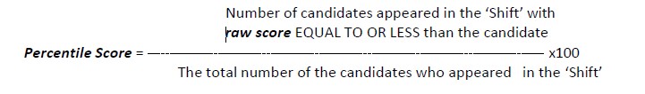 Percentile Score = (Number of candidates who appeared in the shift with raw score equal to or less than the candidate ÷ Total number of candidates who appeared in the shift) × 100