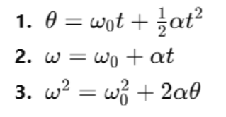 Similar to the equations of linear motion (like v=u+atv = u + atv=u+at), rotational motion also follows its own set of equations that relate angular displacement, velocity, acceleration, and time:
