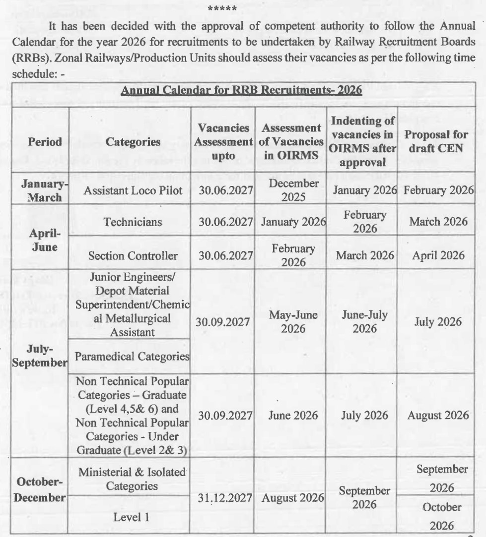 | Assistant Loco Pilot (ALP) | Vacancy assessment valid up to June 2026 | Vacancy assessment extended up to June 2027 |