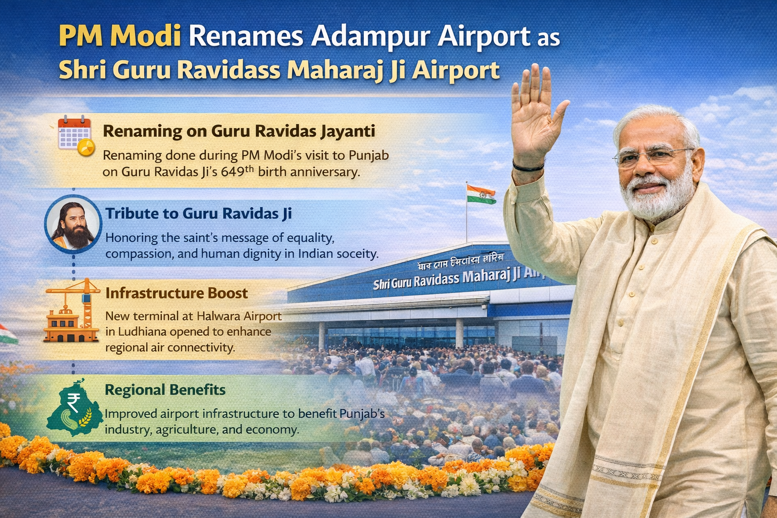 The Prime Minister, Narendra Modi, renamed Adampur Airport, Punjab, Shri Guru Ravidass Maharaj Ji Airport, Adampur, in honour of the saint and social reformist Sant Guru Ravidas Ji on his 649th birthday. The renaming of the site to come to be known as Guru Ravidas Ji Sahib was declared by the Prime Minister's office and commemorated the long-standing message of equality, compassion and human dignity that Guru Ravidas Ji taught, as well as a major cultural acknowledgement. In the ceremony, the new terminal building at nearby Halwara Airport was inaugurated, which would help increase the air links and expansion of the region in Punjab.