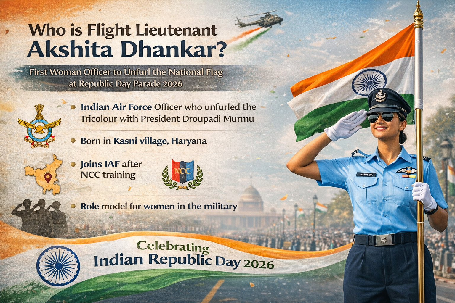 The hoisting of the Tricolour by Flight Lieutenant Akshita Dhankar with President Droupadi Murmu on Republic Day 2026 is a historic and inspirational one. Her accomplishment not only puts women in the limelight of the Indian Armed Forces but also illustrates discipline and leadership, and it is a beacon of national pride, coming out to the generations to come and giving them the hope they need in serving the country.