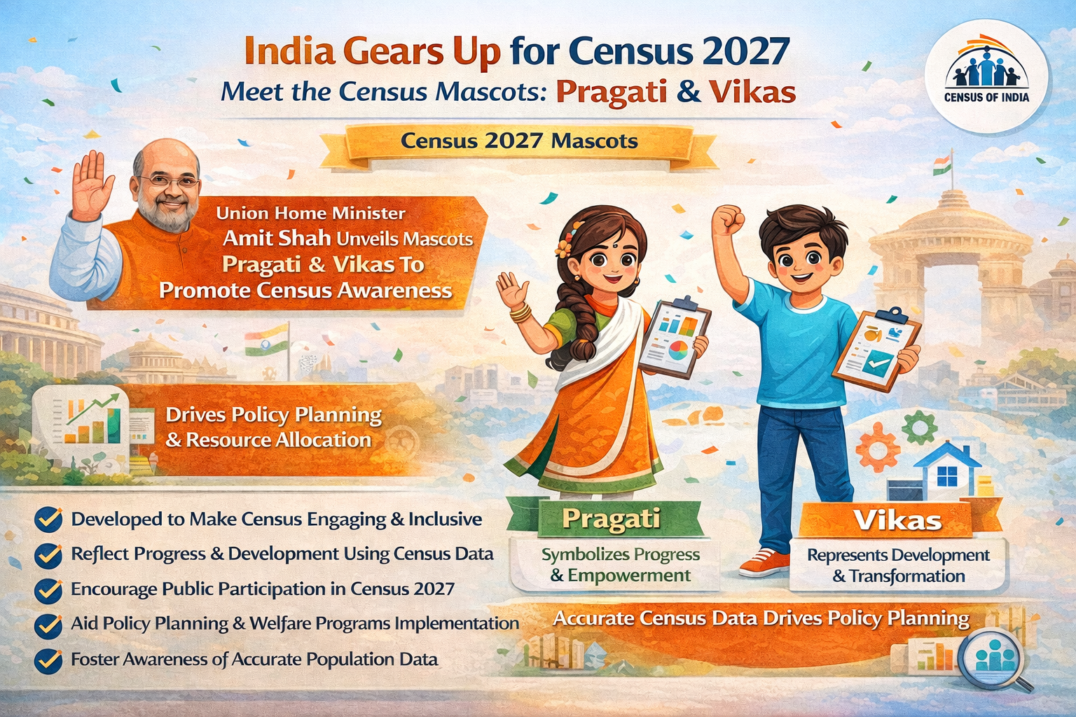 The unveiling of the mascots “Pragati” and “Vikas” by Union Home Minister Amit Shah highlights the government’s effort to make the upcoming Census of India 2027 more engaging and widely understood. By using relatable symbols of progress and development, the initiative aims to encourage greater public participation and awareness about the importance of accurate population data. Reliable census information will support better policymaking, fair resource distribution, and effective governance. Ultimately, the campaign reinforces the role of the census as a vital tool for India’s inclusive growth and long-term national planning.