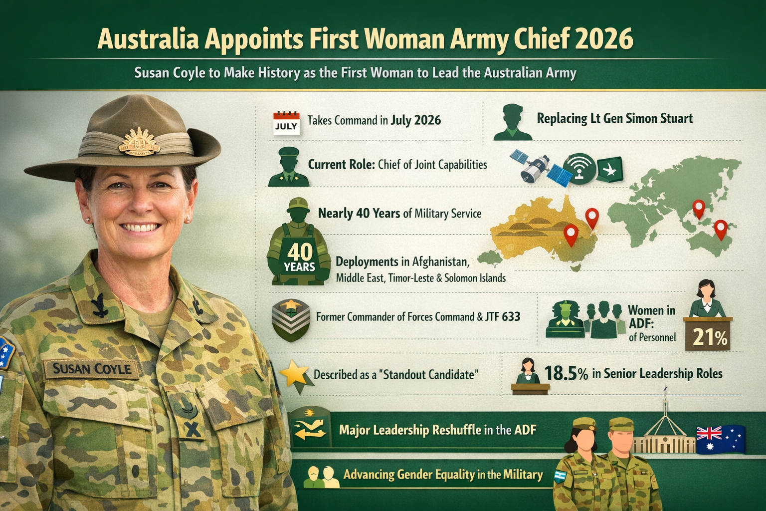 Australia has made history by appointing Susan Coyle as the first woman to lead its army in its 125-year history. Currently serving as Chief of Joint Capabilities, she will assume the role of Chief of Army in July 2026, replacing Lt Gen. Simon Stuart. With nearly four decades of military experience, including deployments in Afghanistan and the Middle East, her appointment marks a significant step toward gender equality in the Australian Defence Force. This historic decision reflects Australia’s commitment to modernising its military leadership and increasing female representation in senior roles.