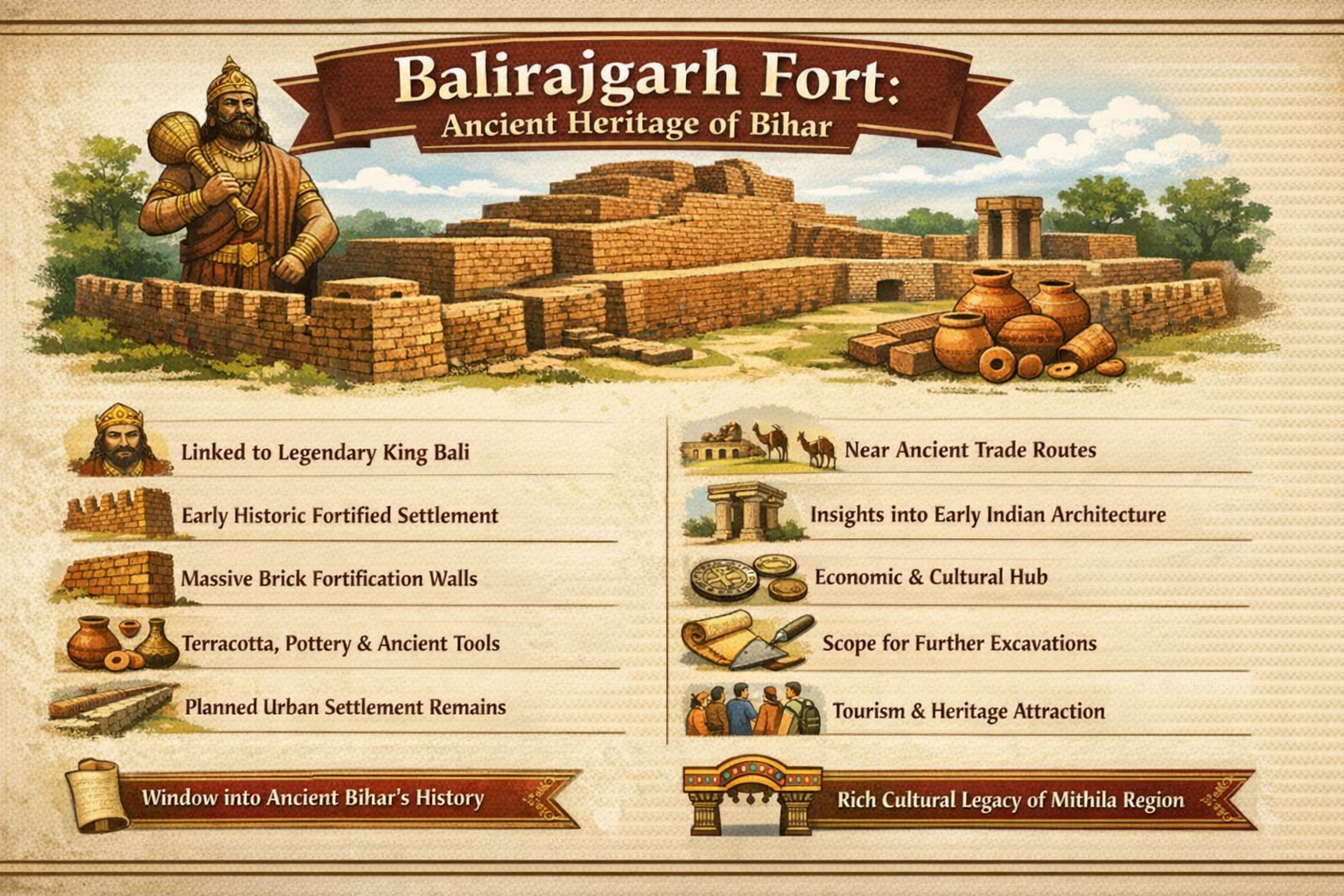 Balirajgarh Fort is an important archaeological and historical site located in the Madhubani district of Bihar. Believed to date back to ancient times, the fort is associated with the legendary King Bali and holds immense cultural and historical significance. Spread across a vast area, its ruins reflect the architectural style and urban planning of early civilisations in the region. Excavations by the Archaeological Survey of India have revealed fortifications, pottery, and other artefacts, indicating a well-developed settlement. Today, it stands as a symbol of Bihar’s rich heritage and attracts historians, researchers, and tourists alike.