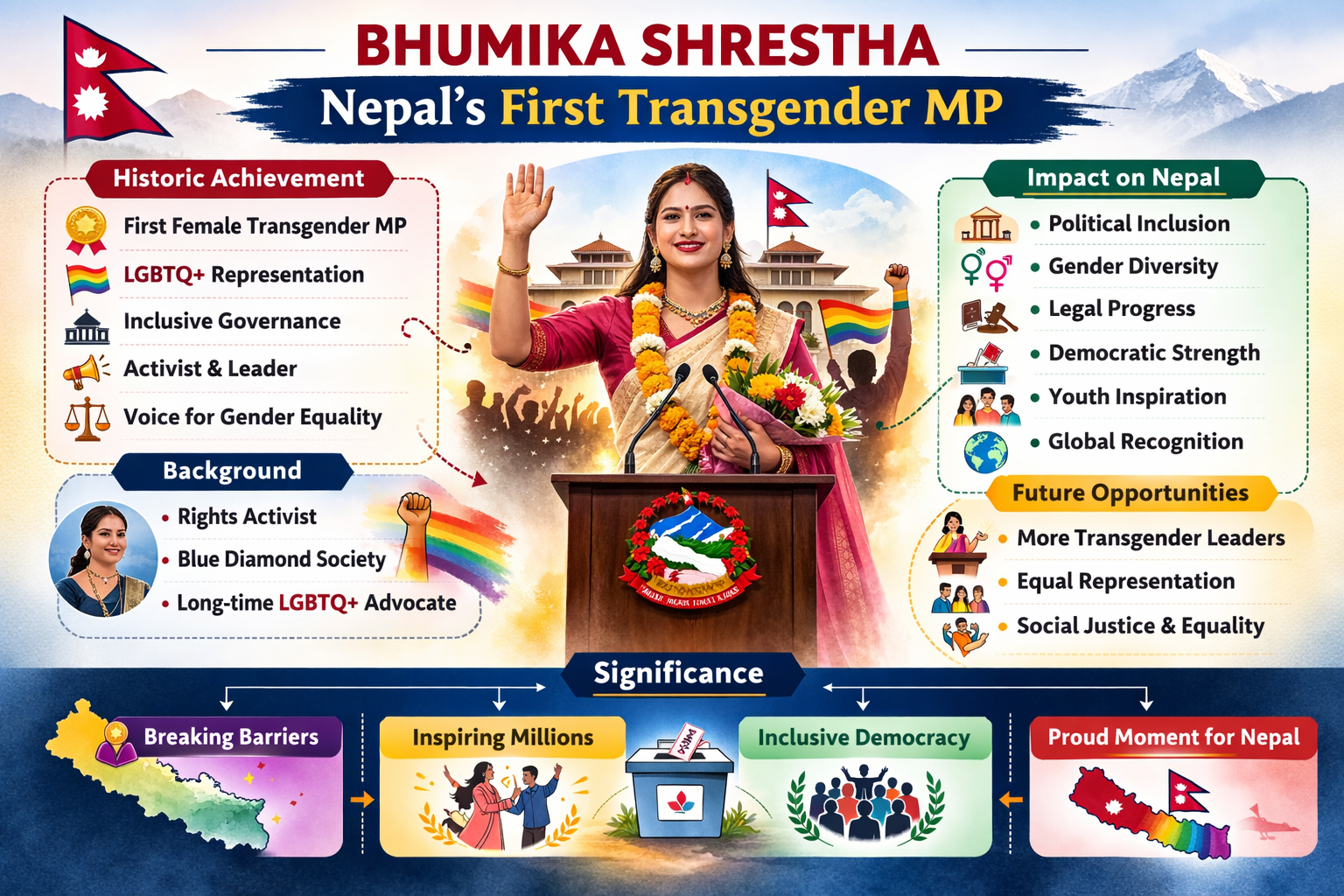 Bhumika Shrestha’s election as Nepal’s first transgender MP is a historic milestone that reinforces the importance of inclusivity and equal representation in politics. It highlights Nepal’s progressive approach toward gender diversity and sets an inspiring example for South Asia and the world. Her achievement not only empowers the LGBTQ+ community but also encourages greater participation of marginalised groups in governance, signalling a positive shift toward equality, social justice, and democratic values.