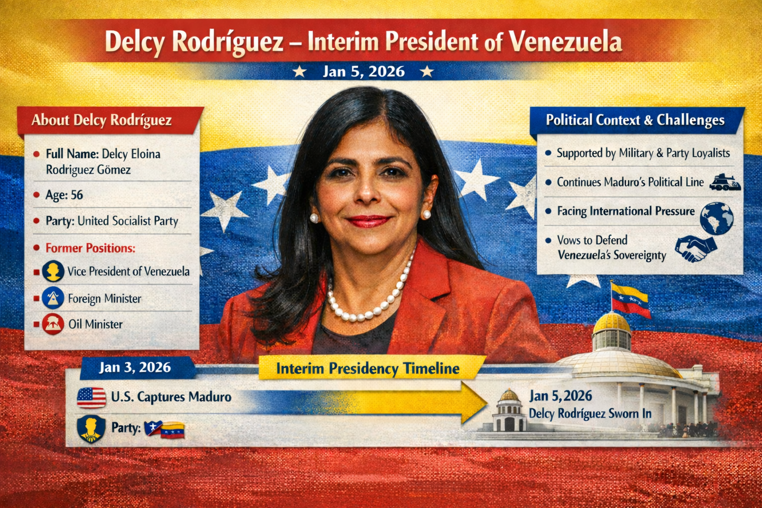 On January 5, 2026, two days after U.S. troops ousted President Nicolás Maduro to stand trial in New York on drug charges, the National Assembly officially swore in Delcy Rodríguez as interim president. One of the oldest and most experienced members of the Maduro government, Rodriguez declared before lawmakers in Caracas her commitment to provide leadership on behalf of all Venezuelans in the face of deep political uncertainty. Ruling party loyalists in the parliament condemned the apprehension of Maduro and vowed their assistance to Rodriguez in the leadership of Venezuela as it faces internal tensions and international pressure.