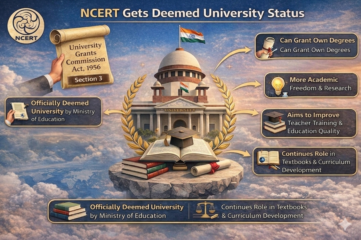 The major development in India's education system: the Ministry of Education has formally given the National Council of Educational Research and Training the status of a deemed university. This move has been arrived at in accordance with the University Grants Commission Act of 1956, which permits individual institutions to operate with academic freedom. It can now design its own courses, grant degrees, and increase its research activities with this status. The relocation is meant to enhance the teaching and learning process, curriculum and creativity in school education in the country with more leniency in the academic system.