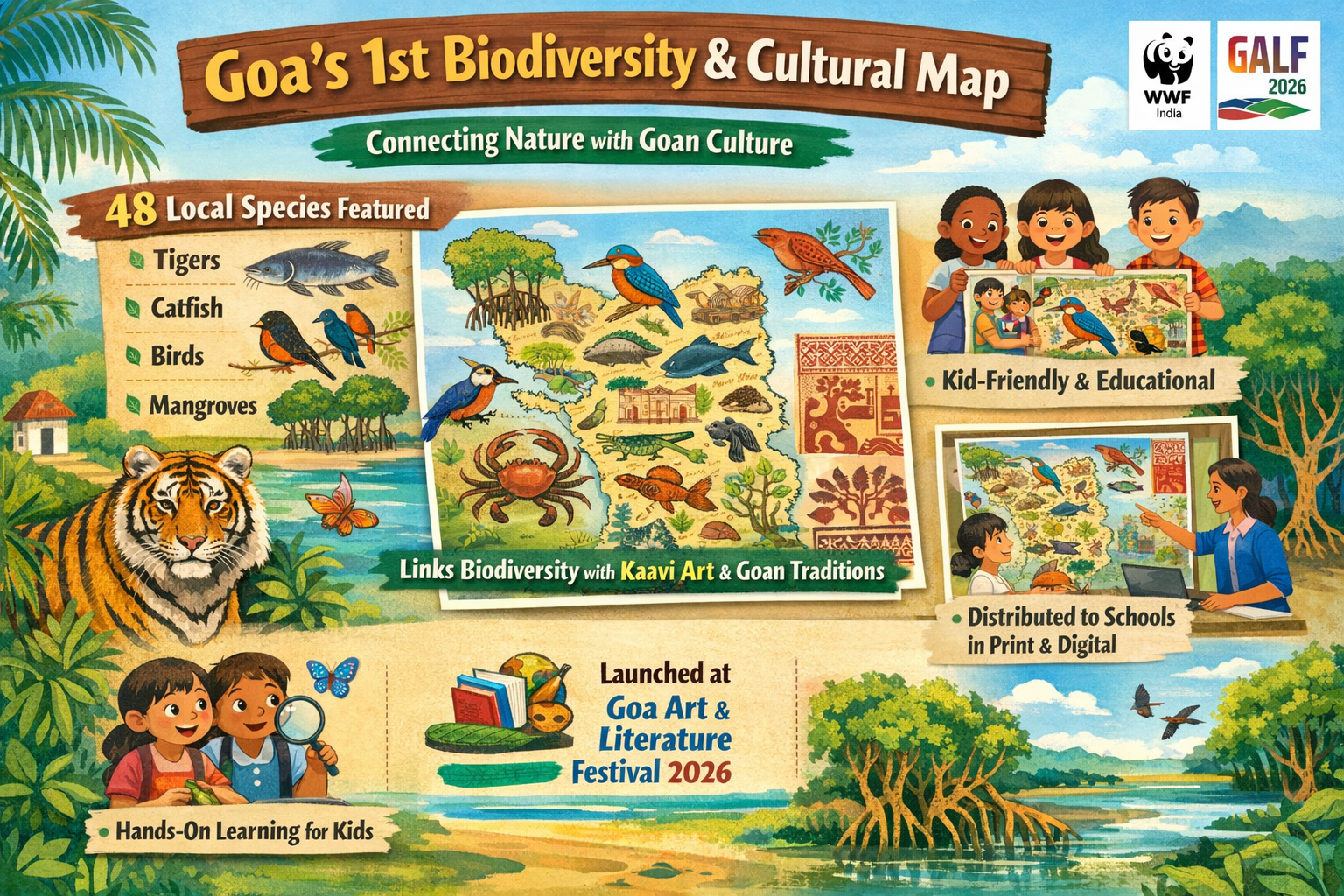The first biodiversity and cultural map has officially been released in Goa, which was done through the support of WWF India. The new visual guide points out 48 species that are commonly distributed throughout the state, including catfish and mangroves as well as tigers and local birds, and matches them with the elements of the traditional Goan culture, such as Kaavi art. The map will be kid-friendly and distributed to the schools both electronically and physically as part of a larger initiative of reinforcing the environmental consciousness and relating the young learners to the natural and cultural heritage of the region.
