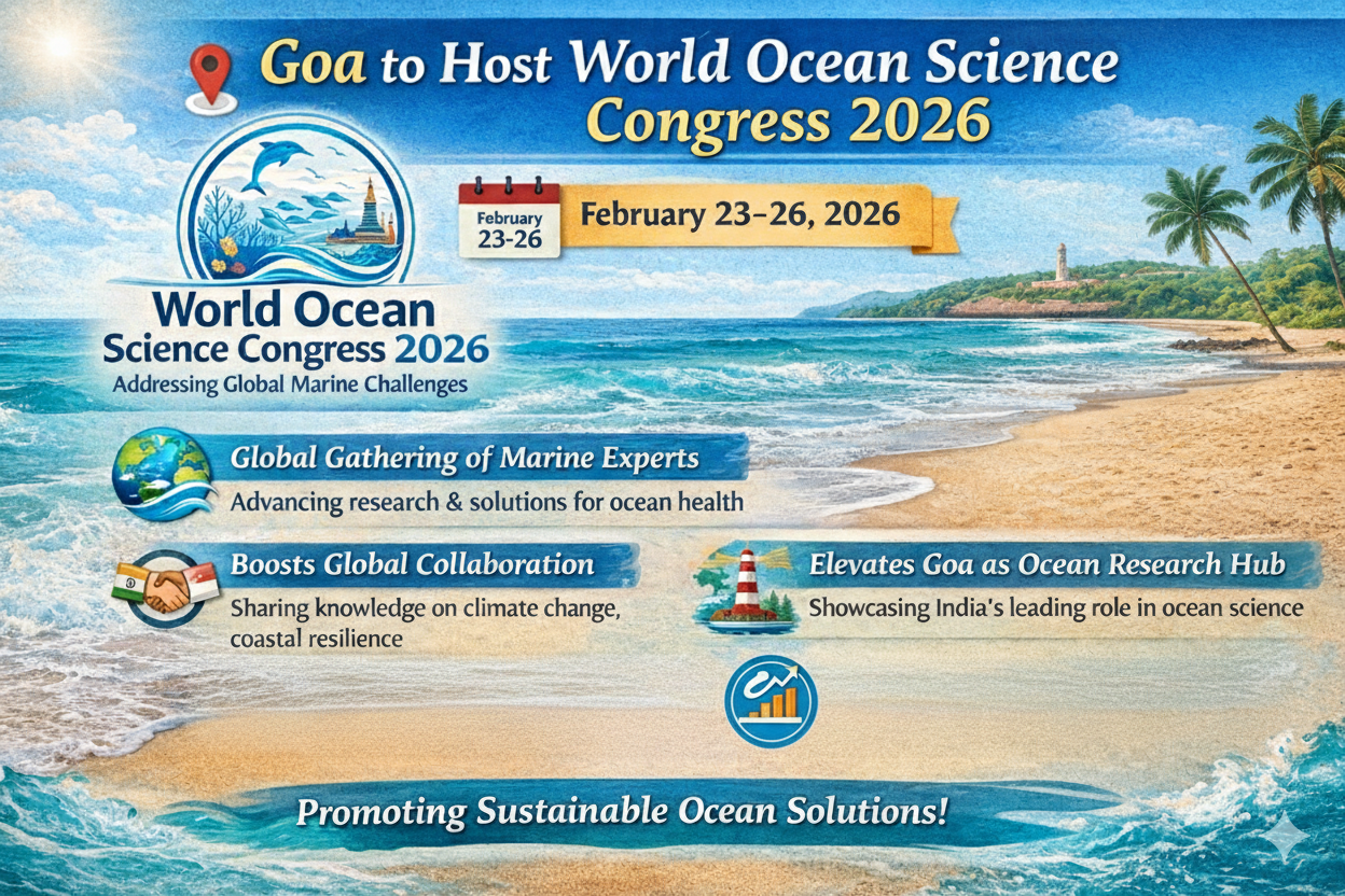 Goa will host the World Ocean Science Congress 2026 from February 23 to 26, bringing together leading marine scientists, policymakers, researchers, and industry experts from around the globe. The four-day event will focus on advancing ocean research and strengthening global collaboration to address pressing marine challenges. Key discussions will cover climate change impacts, ocean health, coastal resilience, deep-sea exploration, and sustainable use of marine resources. The congress aims to encourage knowledge exchange, showcase scientific innovation, and promote practical solutions for protecting marine ecosystems. The gathering also reflects India’s growing contribution to ocean science and its commitment to supporting a sustainable and responsible blue economy.