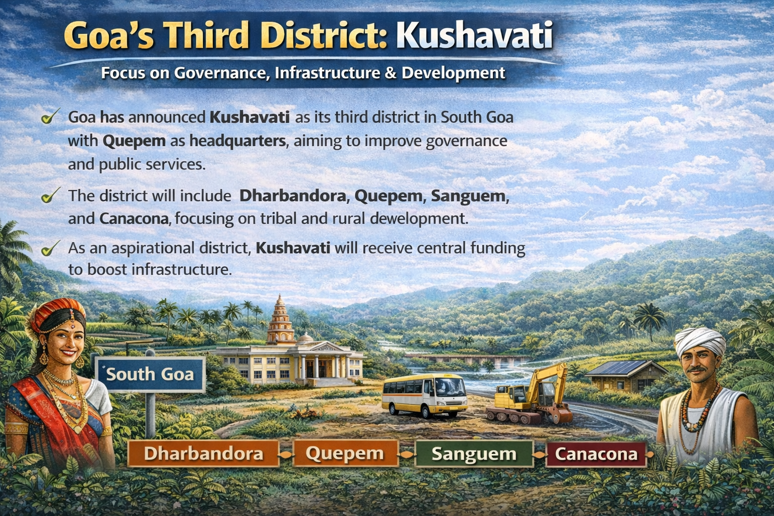Goa has formally announced the creation of its third district, named Kushavati, marking a major administrative change in the coastal state. Chief Minister Pramod Sawant announced that the new district would be created in South Goa and would consist of four talukas, namely Dharbandora, Quepem, Sanguem, and Canacona, with Quepem as the headquarters. The area's cultural heritage and identity are reflected in the district's name, derived from the Kushavati River, which once flowed through the region. The third district of Goa is expected to strengthen governance and the quality of public services while also boosting regional development, particularly among tribal and rural communities.