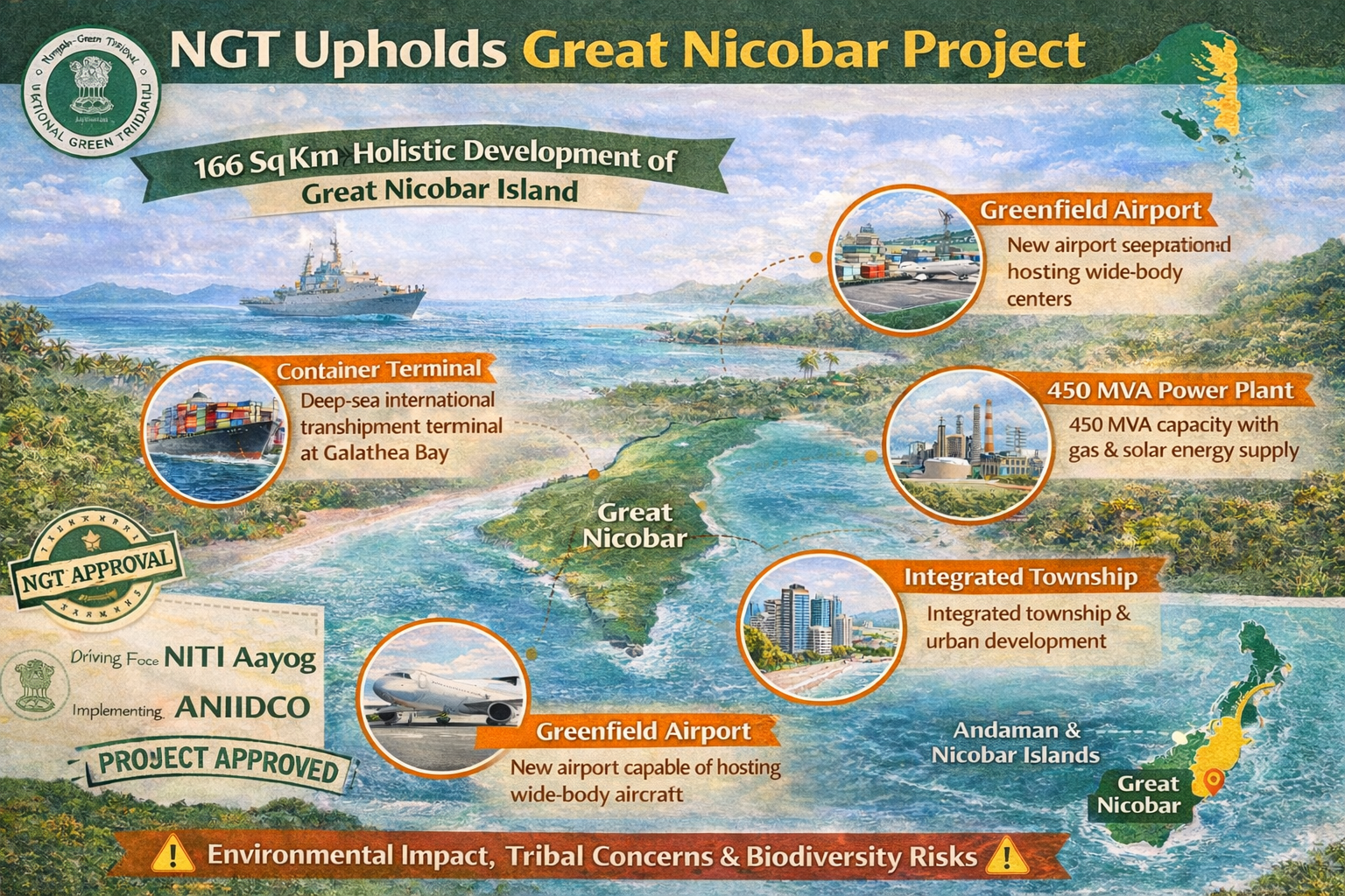 The National Green Tribunal (NGT) has upheld the environmental clearance for the Great Nicobar Island development project, dismissing multiple legal challenges and finding “no good ground to interfere” with prior approvals. The tribunal’s Eastern Zone bench emphasised that the environmental clearance includes safeguards and that strict compliance with all conditions must be ensured as the project moves forward. This decision clears the way for a major infrastructure plan spanning about 166 square kilometres, including an international container terminal, airport, power plant, and township, with authorities instructed to adhere closely to regulatory and environmental requirements.