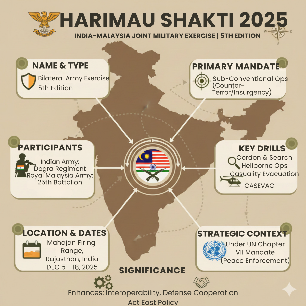 The fifth version of the India-Malaysia bilateral military drill is called the Harimau Shakti 2025.