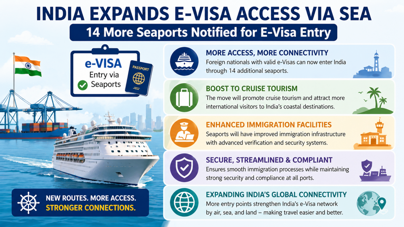 This move enables foreigners with valid e- Visas to travel to India via additional sea routes, enhancing accessibility.