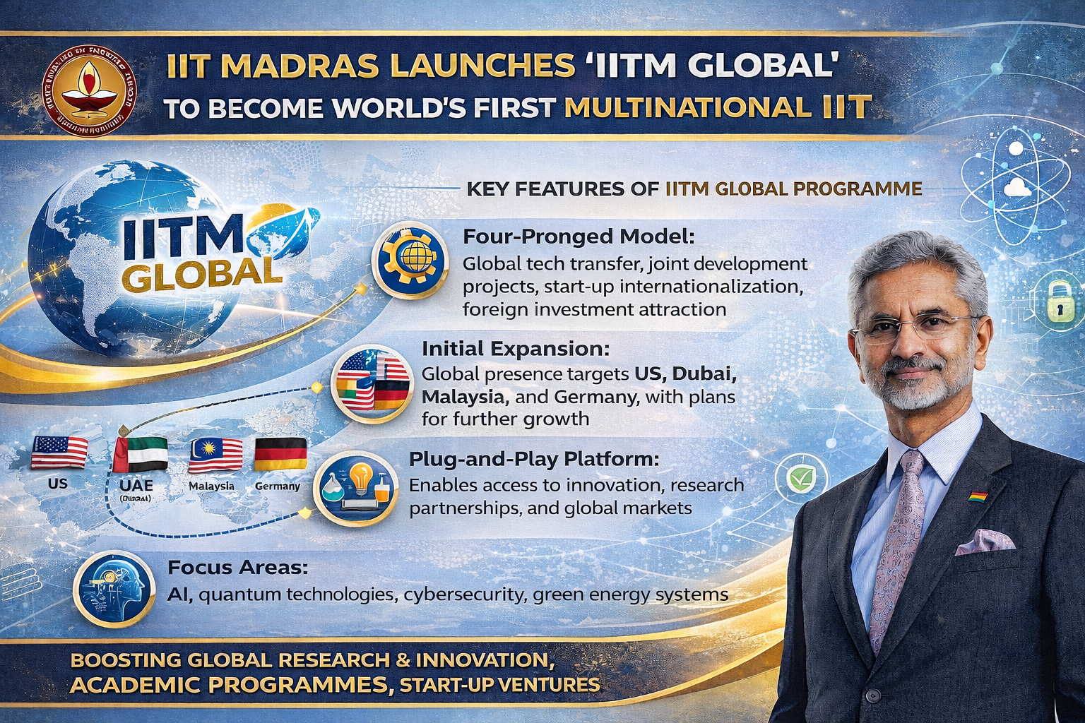 Indian Institute of Technology Madras has introduced a new project known as IITM Global to make the institute the first multinational IIT in the world. External Affairs Minister Dr S Jaishankar launched the programme and aims at increasing the global presence of IIT Madras through research, academic programmes and start-up ventures. It will support collaborative research, consultancy, technology transfer, and innovation infrastructure in the major areas of AI, quantum technologies, cybersecurity, and green systems. This international drive will lead to the development of cross-border education and innovation, thereby enhancing India's position as a global provider of higher education.