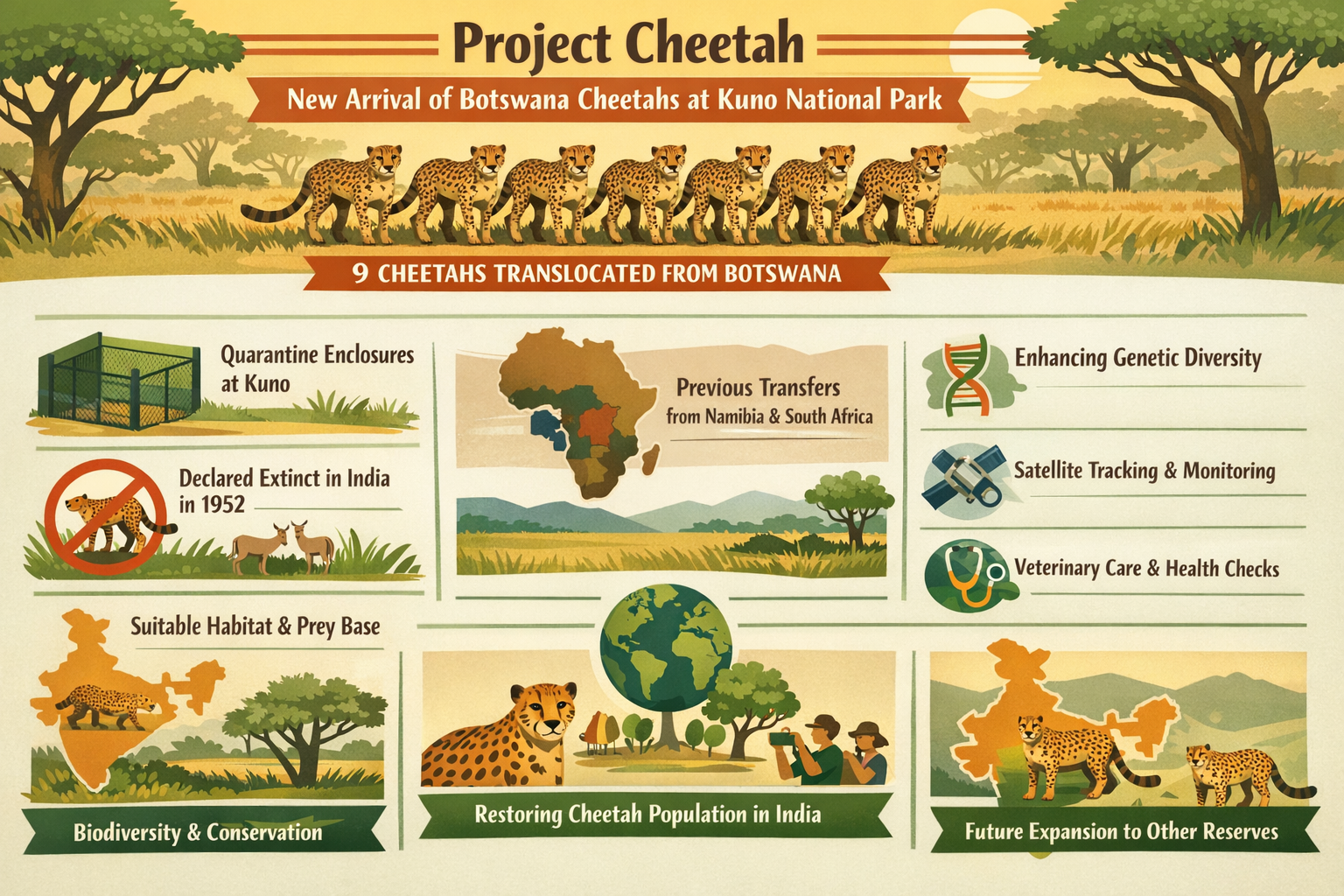 India’s ambitious effort to restore the cheetah population has received a fresh boost with the arrival of nine cheetahs from Botswana at Kuno National Park. The translocation is part of National Tiger Conservation Authority’s broader wildlife restoration plan under Project Cheetah. After becoming extinct in India in 1952, the cheetah’s reintroduction marks a historic conservation milestone. These new arrivals aim to enhance genetic diversity and stabilize the growing population at Kuno. The initiative reflects India’s commitment to biodiversity conservation, ecological balance, and global cooperation in wildlife management and species recovery programs.