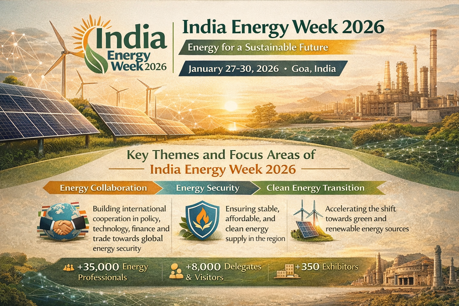 India Energy Week 2026 will be held in Goa as a leading global forum for energy discussion, which aims at innovation, sustainability, and inclusive access to energy. The event supports India's position in the global energy transformation and prepares a sustainable energy future through emphasising renewable technologies, strategic alliances, and policy frameworks.