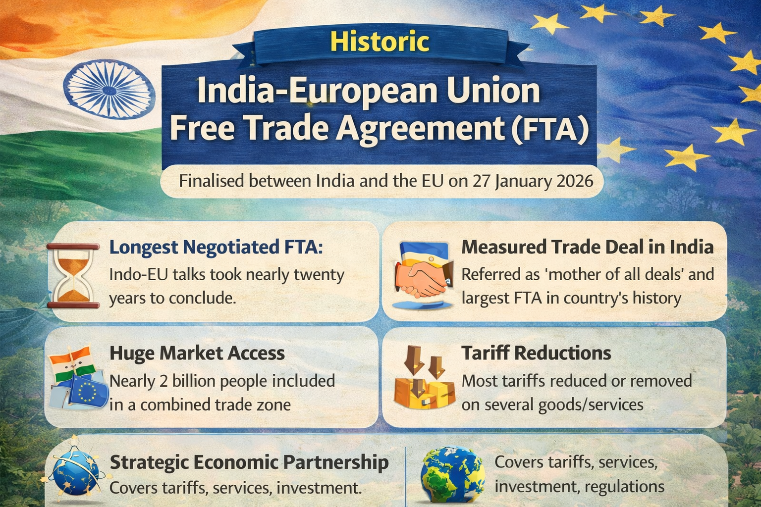The India-European Union Free Trade Agreement (FTA) is one of those historic trade agreements that were finalised between the Republic of India and the European Union on 27 January 2026, after almost twenty years of discussions. It seeks to open up trade and investment by shrinking or getting rid of tariffs on a large variety of goods and services, and boost regulatory collaboration and market access between the two economies. India is also looking to reduce tariffs on major imports, in India including automobiles and other industrial goods, and the EU will significantly reduce tariffs on Indian exports, which will see economic integration between the two sides and generate new business opportunities in various sectors.