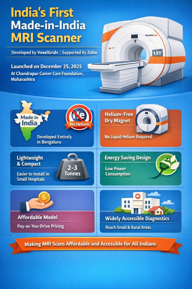 As the latest technology in healthcare, Magnetic Resonance Imaging (MRI) has seen a significant breakthrough in India, with the Bengaluru-based startup VoxelGrids launching the first fully indigenous MRI scanner, supported by Zoho Corporation. The 1.5 Tesla MRI scanner was developed over 12 years and launched on December 25, 2025. It is currently operating at the Chandrapur Cancer Care Foundation in Maharashtra, reducing dependence on imported diagnostic equipment. The system is locally engineered with a no-helium design, making it lighter, more energy-efficient, and approximately 40 per cent more affordable than traditional machines, thereby making high-quality medical imaging much more accessible to all Indians.