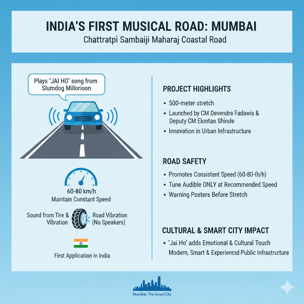 The first musical road in Mumbai is on a 500-metre stretch of Chhatrapati Sambhaji Maharaj Coastal Road. The distinctive road has a built-in sound system that plays the iconic song 'Jai Ho' from the movie Slumdog Millionaire when cars drive over grooves at a certain speed of approximately 60-80 km/h, producing sound through the vibration of tyres and the road. The musical experience, which could be heard in the vehicle, was launched by the Maharashtra Chief Minister Devendra Fadnavis and the Deputy CM Eknath Shinde. The project will be seeking to integrate innovation and road safety through the promotion of consistent speeds and driving experience.
