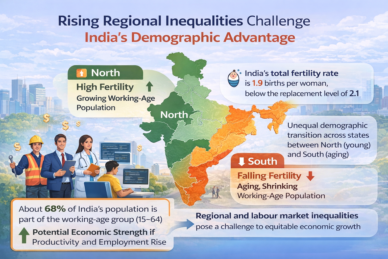 At a very crucial stage, India is facing a demographic advantage. The population imbalance between the southern states, geographical inequalities, and ageing will put the demographic dividend in jeopardy of becoming a divide. Employment, development of skills and equity in the region should have some strategic policies that would exploit the workforce to positively bring about inclusive and sustainable economic growth.