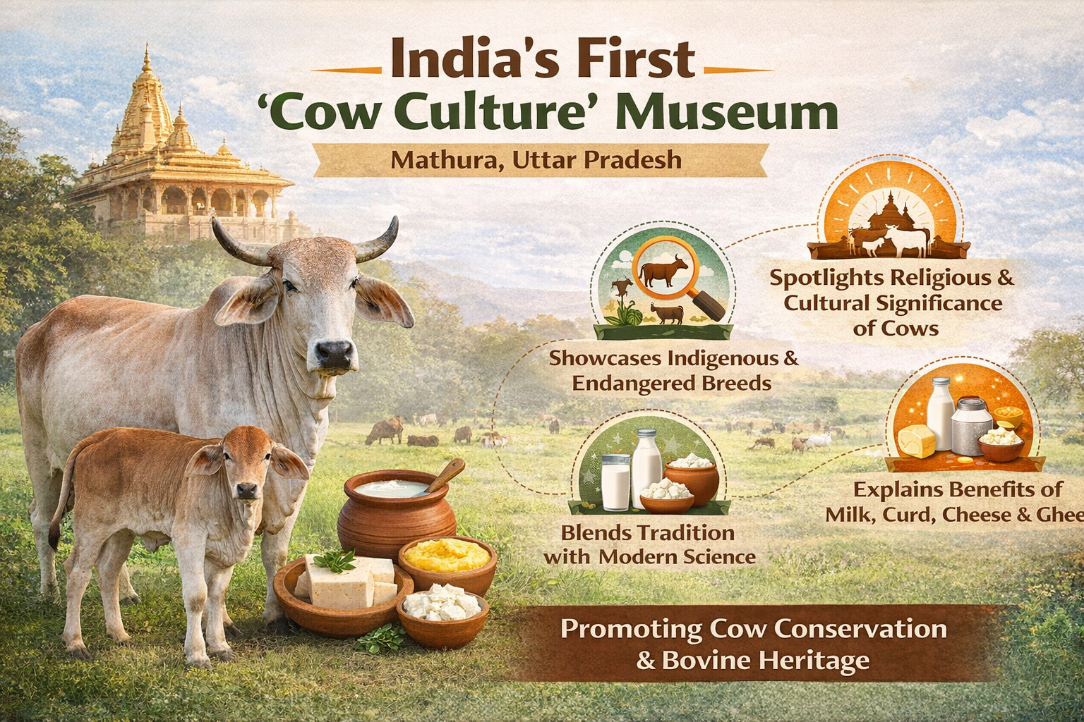 The establishment of India’s first Cow Culture Museum in Mathura reflects an effort to preserve and present the deep cultural, spiritual and economic importance of cattle in Indian society. By combining traditional knowledge with scientific insights, the museum aims to educate visitors about indigenous breeds, dairy practices and sustainable agriculture. It is expected to strengthen awareness about conservation and rural livelihoods while promoting tourism in the Braj region. Overall, the initiative represents a structured attempt to document bovine heritage and encourage informed understanding of the role of cows in India’s cultural and agricultural landscape.