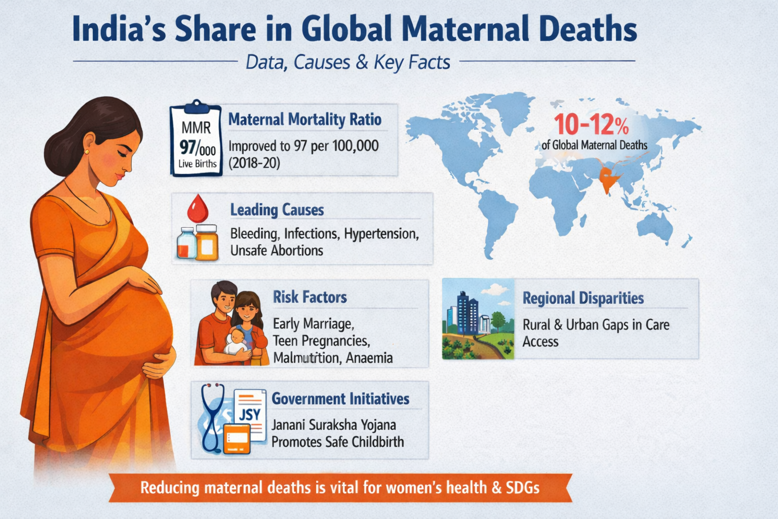 India has a significant proportion of maternal deaths in the world; hence, maternal health is an important priority of public health. According to estimates by international organisations such as the World Health Organisation and UNICEF, the majority of maternal deaths occur in developing countries, such as India. Despite the gradual improvement in the Maternal Mortality Ratio (MMR) in the country, there are several challenges that the country still faces. There is still limited access to quality healthcare, malnutrition, and regional inequalities. Maternal mortality reduction is fundamental to meet the Sustainable Development Goals and provide women in the country with improved health and well-being.