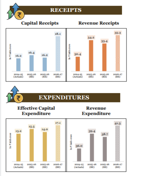 Revenue Receipts increased to 35.3 lakh crore (2026-27BE), compared to 30.4 lakh crore(2024-25Actuals).
