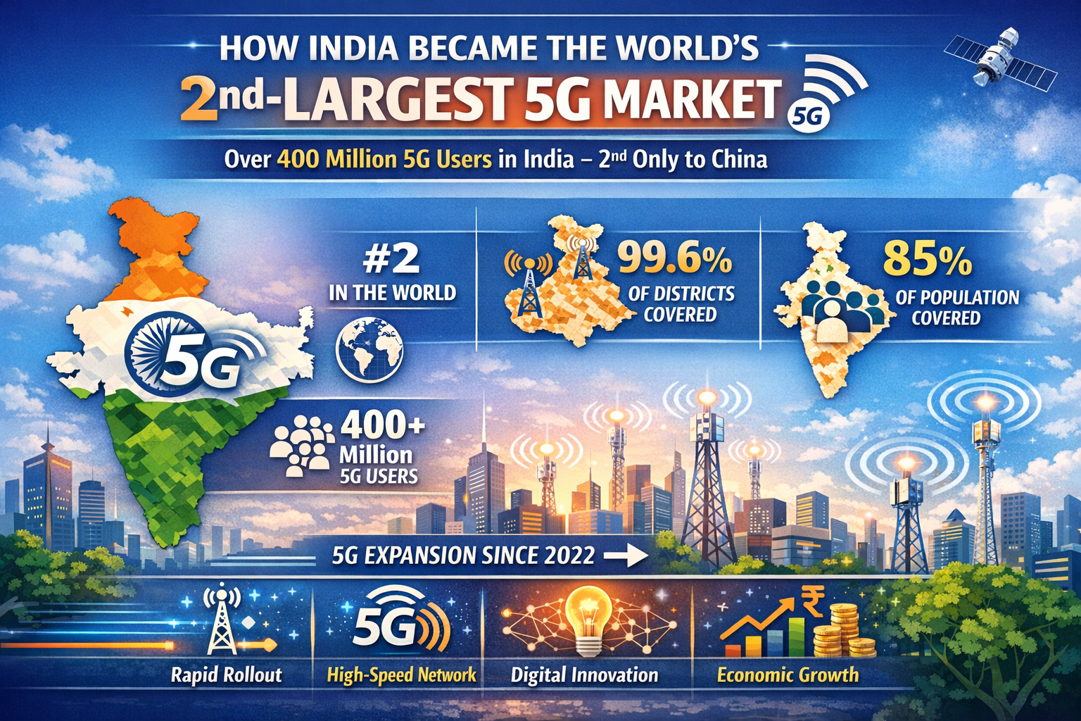 India has become the second biggest 5G market in the world, and the subscriber base of 5G in the country is also over 400 million users, second only to China. This milestone was announced by the Union Communications Minister Jyotiraditya Scindia and signifies how India is rapidly adopting the next generation in mobile technology, and with the highest-speed-in-the-world network coverage, with 5G coverage now reaching about 99.6 per cent of the districts and 85 per cent of the population. The success is an indication of the rapidly digitalising nature of India and a healthy investment in telecommunications infrastructure and 5G, facilitating connectivity, innovation, and economic development.