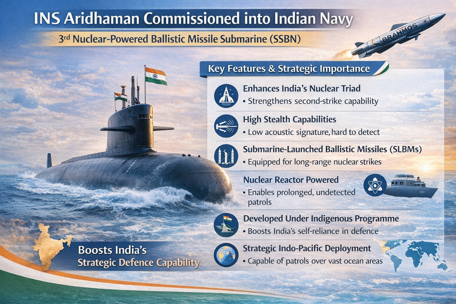 The commissioning of INS Aridhaman into the Indian Navy has been a big step towards enhancing the strategic defence capability of India. Being the third nuclear-powered ballistic missile submarine (SSBN) in the country, INS Aridhaman contributes greatly to the second-strike capability of India and makes it one of the select few countries with a developed nuclear deterrence system. This milestone was developed under India's Indigenous Nuclear Submarine Program, highlighting the country's increasing technological proficiency and investment in national security. Additionally, the maritime component of the Indian Nuclear Triad has been enhanced.
