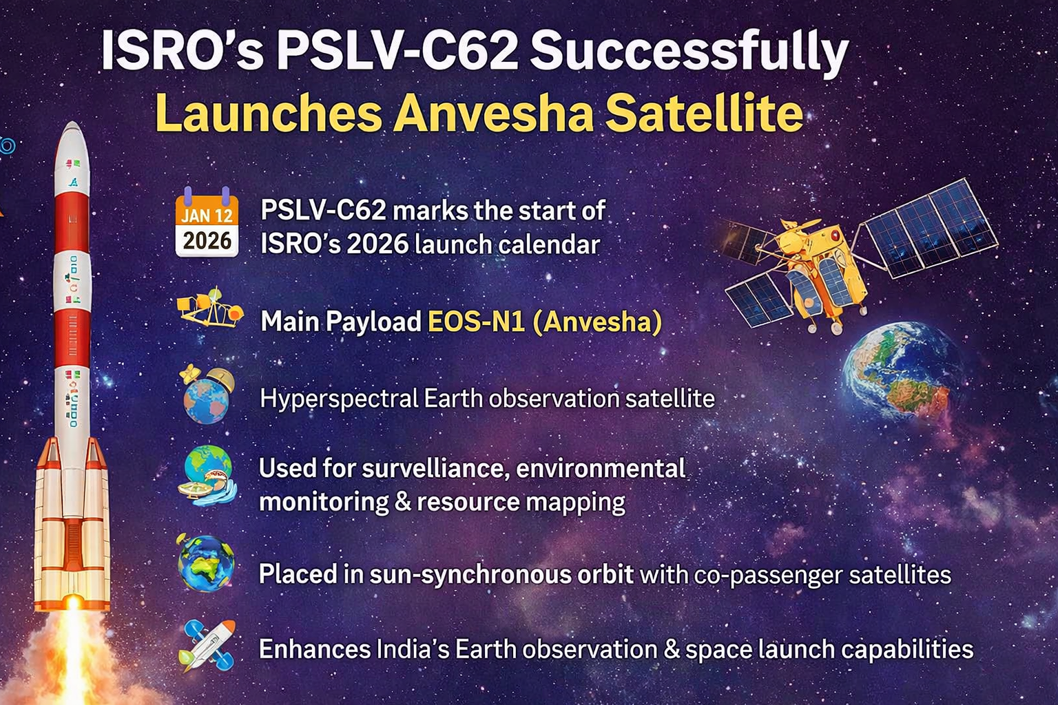 India's Indian Space Research Organisation (ISRO) plans to launch the PSLV-C62 mission on January 12, 2026, from the mission control centre at the Satish Dhawan Space Centre, Sriharikota, marking the start of the Indian space calendar for the year. The main payload is the EOS-N1 satellite, also known as Anvesha, a hyperspectral Earth-observation satellite built to serve three main purposes as a tool for surveillance, environmental monitoring, and resource mapping. The launch will be conducted using the Polar Satellite Launch Vehicle (PSLV), ISRO's workhorse satellite launch vehicle, which will also place several co-passenger satellites into orbit, reflecting the growing Indian presence in space technology and commercial launch services.