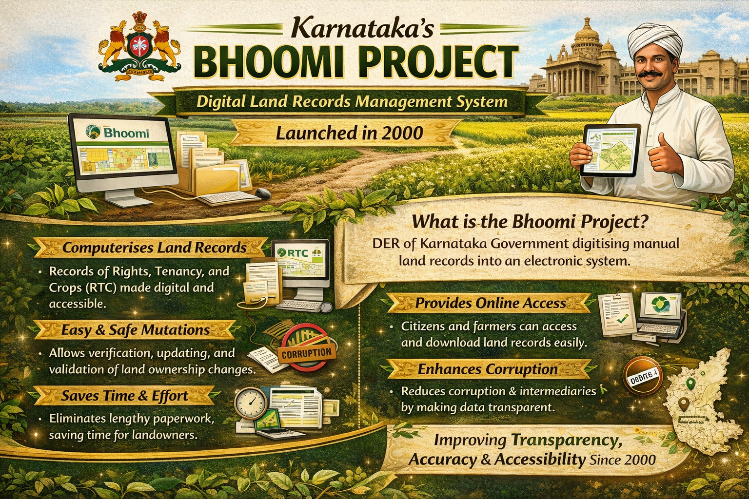 The Bhoomi Project is a masterpiece in digital land records management systems initiated by the Government of Karnataka to digitise the manual, paper-based land records system into an electronic system that is transparent, efficient, and accessible. The project has been in operation since 2000 and has computerised land records, including RTCs (Records of Rights, Tenancy, and Crops). It has also facilitated citizens' access to land documents through kiosks and online services. Serving as a means to facilitate safe mutation operations, verify land ownership, and automatically update status, Bhoomi helps minimise corruption rates and reliance on intermediaries, while enhancing citizens' access to information on property operations throughout the state.