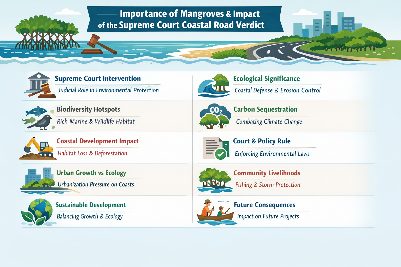 Mangroves have entered the limelight after the recent Supreme Court decision in the Coastal Road Project, the reason being the balancing between development and conservation of the environment. They are invaluable coastal ecosystems to safeguard the coastlines and enhance biodiversity, as well as deal with the effects of climate change. The ruling of the court has sparked debates regarding green infrastructure and the necessity to protect zones that are ecologically important. With the constant development of Indian coastal roads, the role of maintaining mangroves has never been more significant than at the moment, with the need for responsible planning and environmental policies.