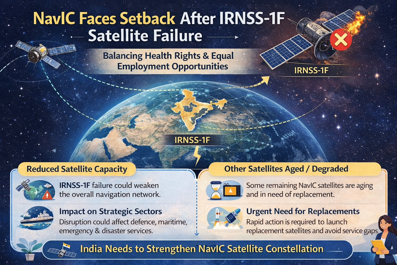 The failure of the IRNSS-1F satellite highlights the challenges of maintaining a reliable navigation constellation. As part of India’s NavIC system, such setbacks underline the need for timely satellite replacements and technological upgrades. Strengthening the satellite network will be crucial to ensure uninterrupted navigation services and to maintain India’s strategic and technological independence in space-based navigation.
