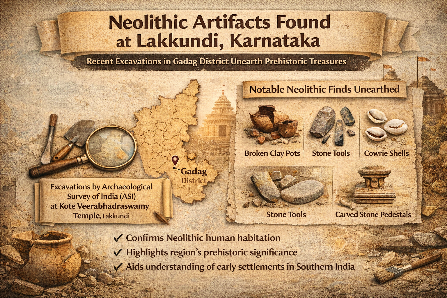 Neolithic relics at Lakkundi village in the Gadag district of Karnataka, through recent archaeological excavations, point to the early antiqueness of the site. These finds were found around the Kote Veerabhadeshwara Temple, highlighting the layer-cake cultural history of Lakkundi on top of its notorious medieval culture. The uncovered Neolithic artefacts are not only helpful to reinforce the argument about the prehistoric importance of the region, but they can also be used to expand the general understanding of the early settlements in southern India. The continuing research is still trying to find something that can be added to the knowledge on the ancient life in the subcontinent.