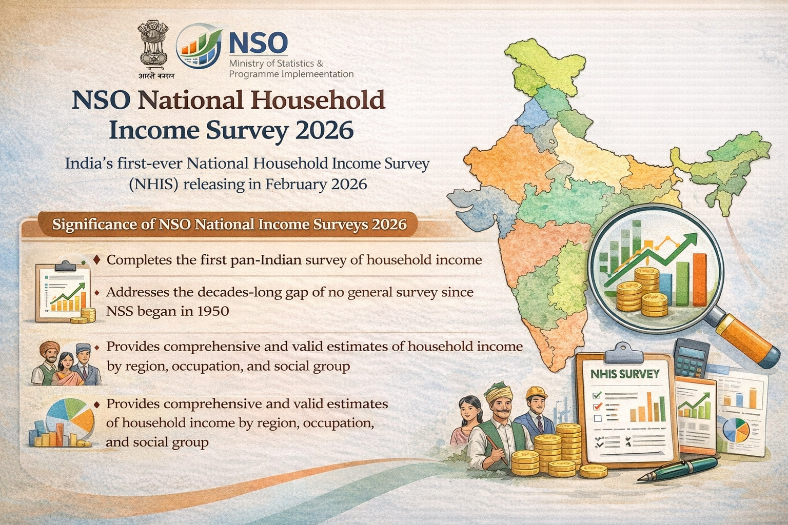 The National Statistics Office (NSO) under the Ministry of Statistics and Programme Implementation (MoSPI) is planning to release India's first-ever National Household Income Survey (NHIS) in February 2026. This survey will produce the first pan-Indian household income and living conditions statistics and associated socio-economic variables to fill long-term gaps in official statistical data. It will facilitate evidence-based policymaking and offer credible information about income trends among regions and groups. The NHIS is a significant leap in empowering the statistical system of India and enlightening economic planning in the future.