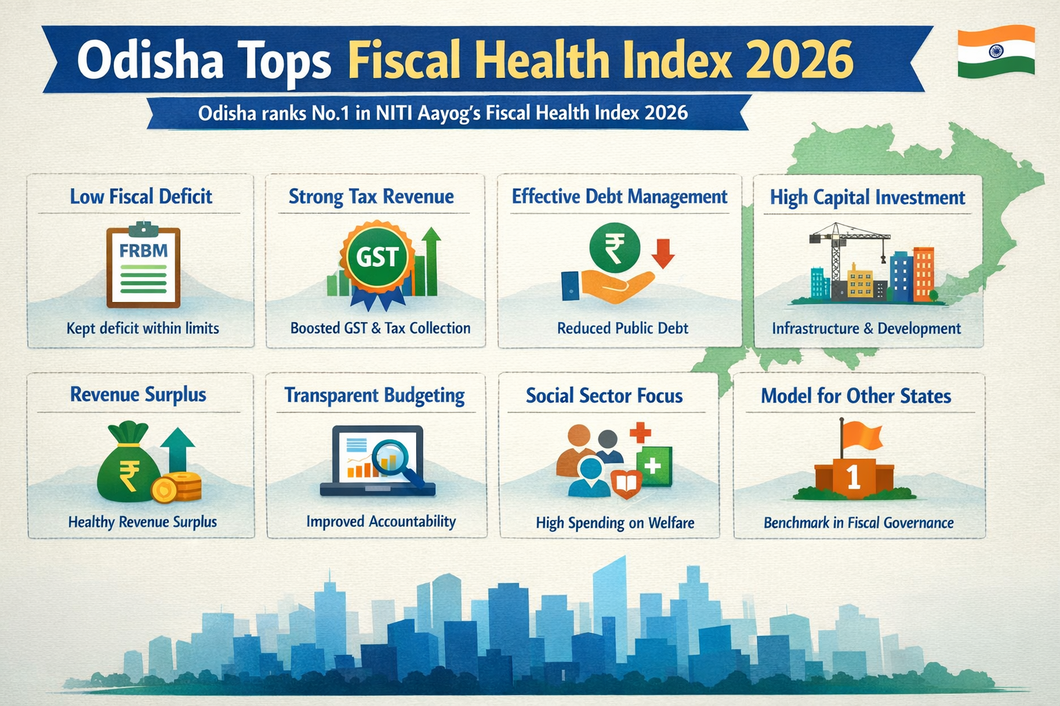 Odisha has once again secured the top position in the Fiscal Health Index (FHI) 2026 released by NITI Aayog, highlighting the state’s strong financial management and fiscal discipline. The index evaluates the financial performance of Indian states based on indicators such as revenue generation, debt management, expenditure quality, and fiscal sustainability. Odisha’s consistent focus on prudent budgeting, improved tax collection, and effective public spending has helped it maintain fiscal stability despite economic challenges. The ranking reflects the state’s ability to balance development priorities with responsible financial practices, making it a model for other states aiming to strengthen governance and economic resilience.