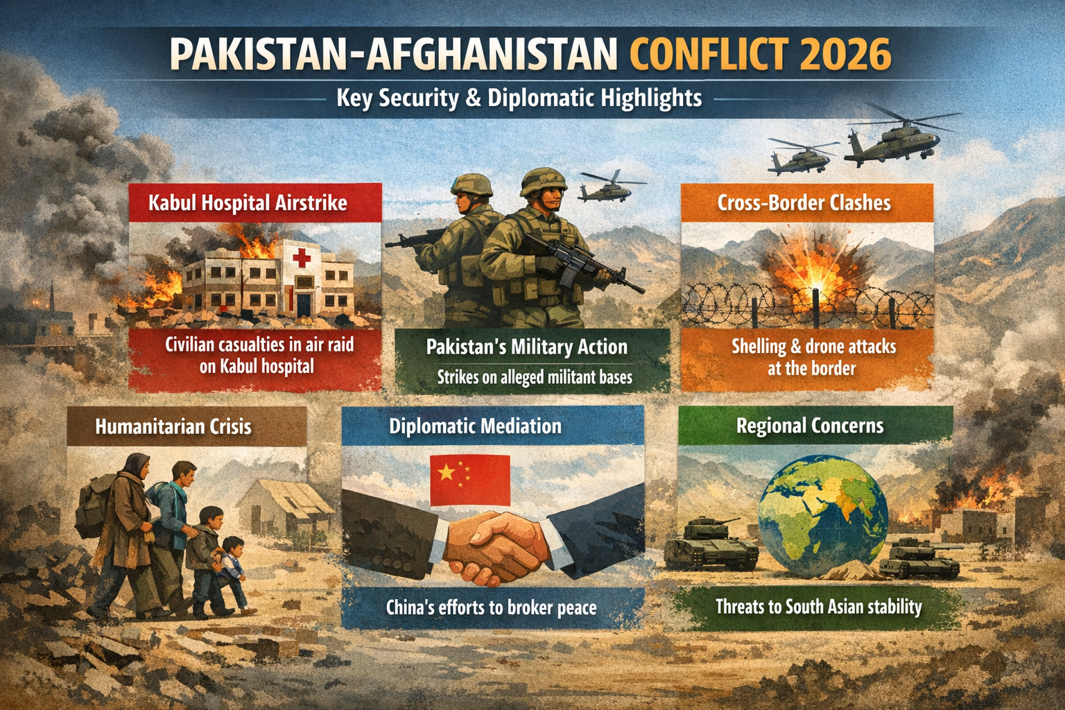 The conflict between Pakistan and Afghanistan has escalated sharply in 2026, creating one of the most pressing security challenges in South Asia. Tensions intensified after Pakistan launched airstrikes inside Afghan territory, claiming they targeted militant bases along the Durand Line. Afghan authorities strongly reject these claims, arguing that strikes have hit civilian areas, including hospitals and residential zones, raising concerns about violations of sovereignty and international law. Hundreds of civilians have reportedly died or been injured, and thousands have been displaced. This crisis has also raised alarm among regional and global actors, including the United Nations, which has called for restraint and thorough investigations. Meanwhile, China and other diplomatic actors have attempted to mediate, urging both countries to engage in dialogue and prevent further escalation. The situation reflects longstanding mistrust, unresolved security disputes, and challenges in counter‑terrorism cooperation between Islamabad and Kabul.