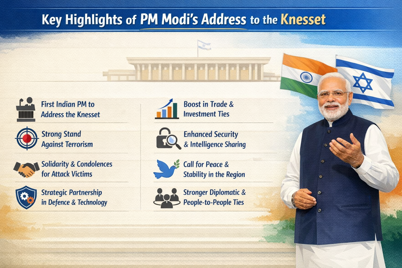 Prime Minister Narendra Modi’s address to the Knesset underscored the depth and maturity of India–Israel relations. By reaffirming strong support for Israel and condemning terrorism, he highlighted shared security concerns and democratic values. The speech reflected growing strategic cooperation in defence, technology, and trade. Overall, the address signalled India’s commitment to strengthening bilateral ties while advocating peace and stability in the region.