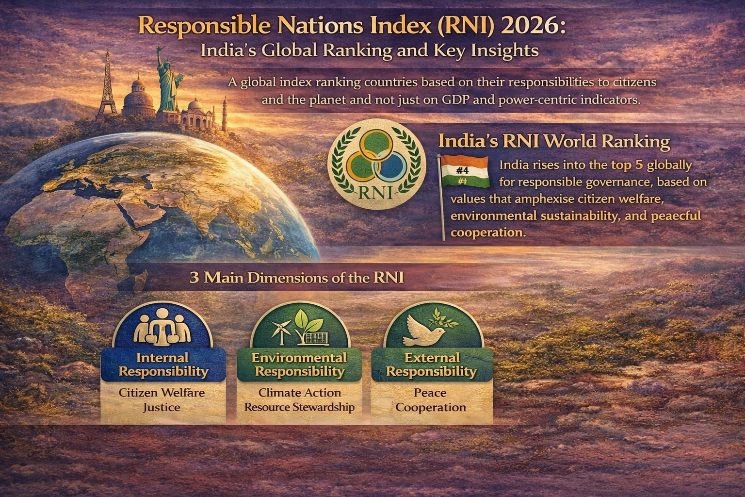Responsible Nations Index (RNI) is a revolutionary scheme that gives nations a rating on ethical governance, social and environmental well-being, and global responsibility. It promotes values instead of coercion; it urges countries and even India to think more in terms of sustainable development, national well-being, and international collaboration and make the global community more responsible and accountable.