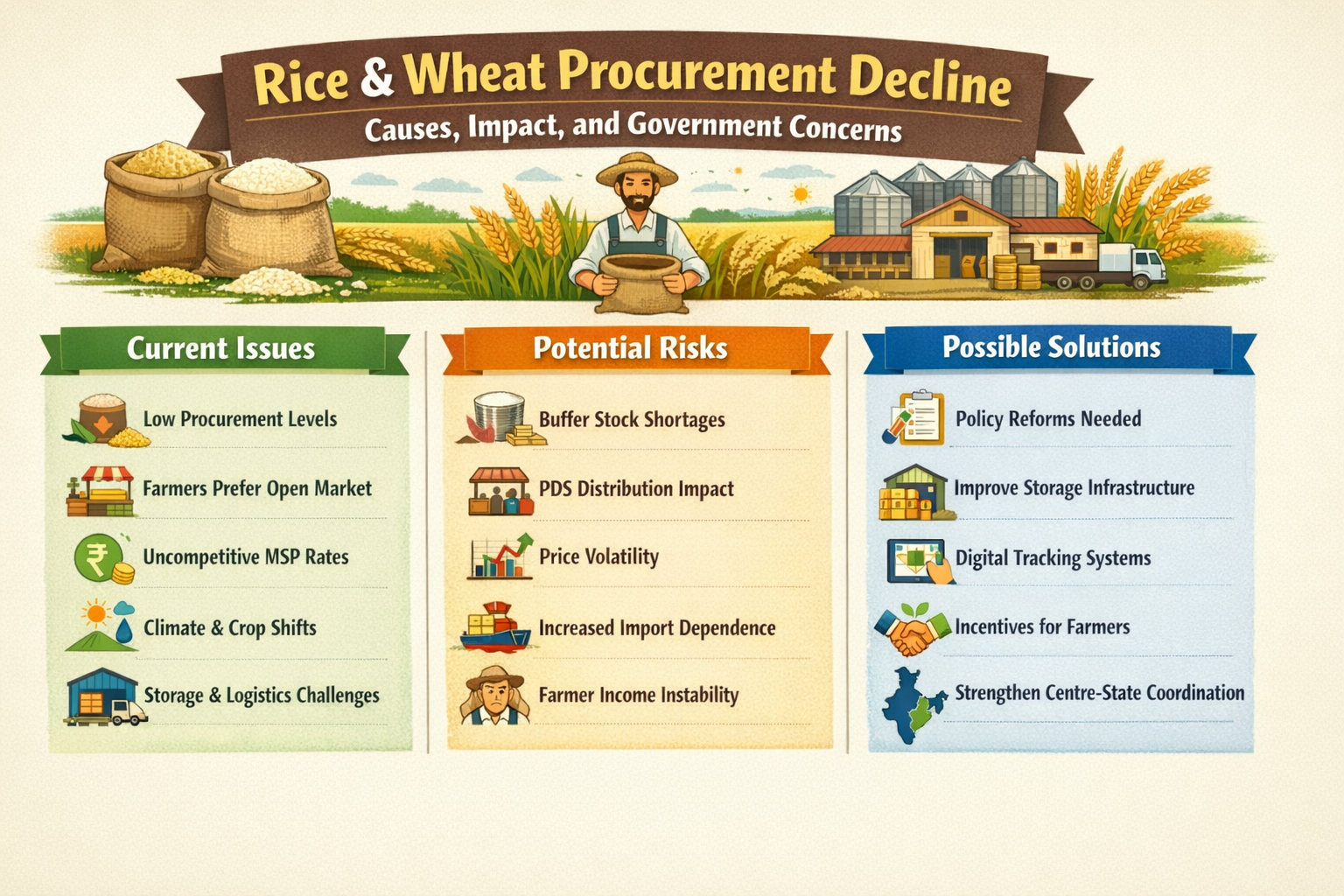 The continued decline in rice and wheat procurement raises serious concerns about India’s food security and agricultural stability. It highlights challenges in MSP effectiveness, farmer participation, and supply chain efficiency. Addressing these issues through policy reforms, better incentives, and improved infrastructure is essential. Ensuring adequate buffer stocks and strengthening procurement systems will be crucial to maintain price stability, support farmers, and secure the nation’s long-term food needs.