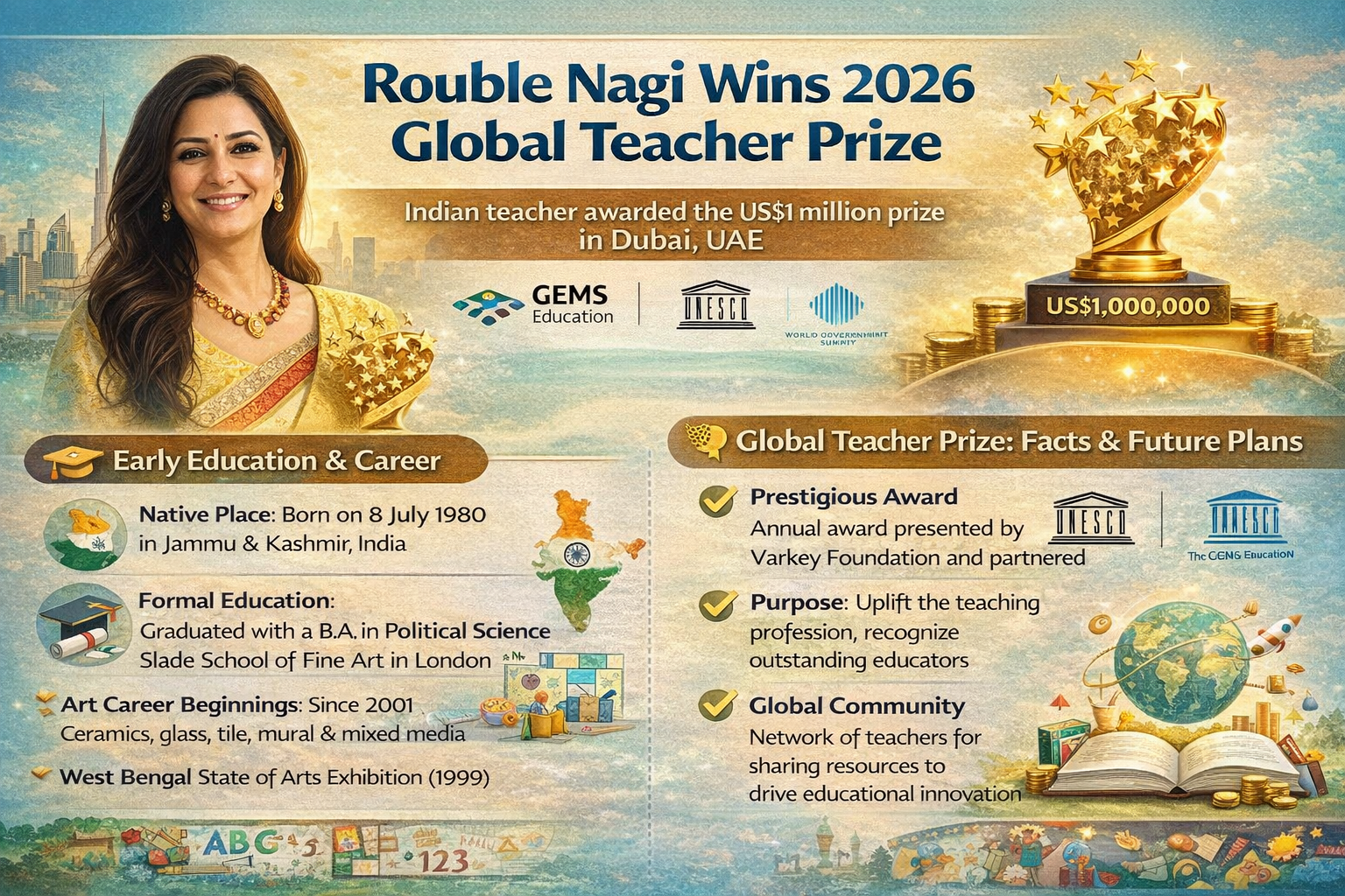 Indian teacher Rouble Nagi has claimed the highly coveted 2026 GEMS Education Global Teacher Prize, which is presented with the US$1 million prize in Dubai, the United Arab Emirates, at the World Government Summit. It is awarded by the Varkey Foundation and is partnered with UNESCO, and it is given to recognise significant contributions in the field of education, either locally or globally. Nagi was chosen among thousands of nominations in her creative work by the Rouble Nagi Art Foundation, which has created more than 800 learning centres and converted public walls into educational interactive and educational murals to educate marginalised children in India in literacy, numeracy, science, and life skills.