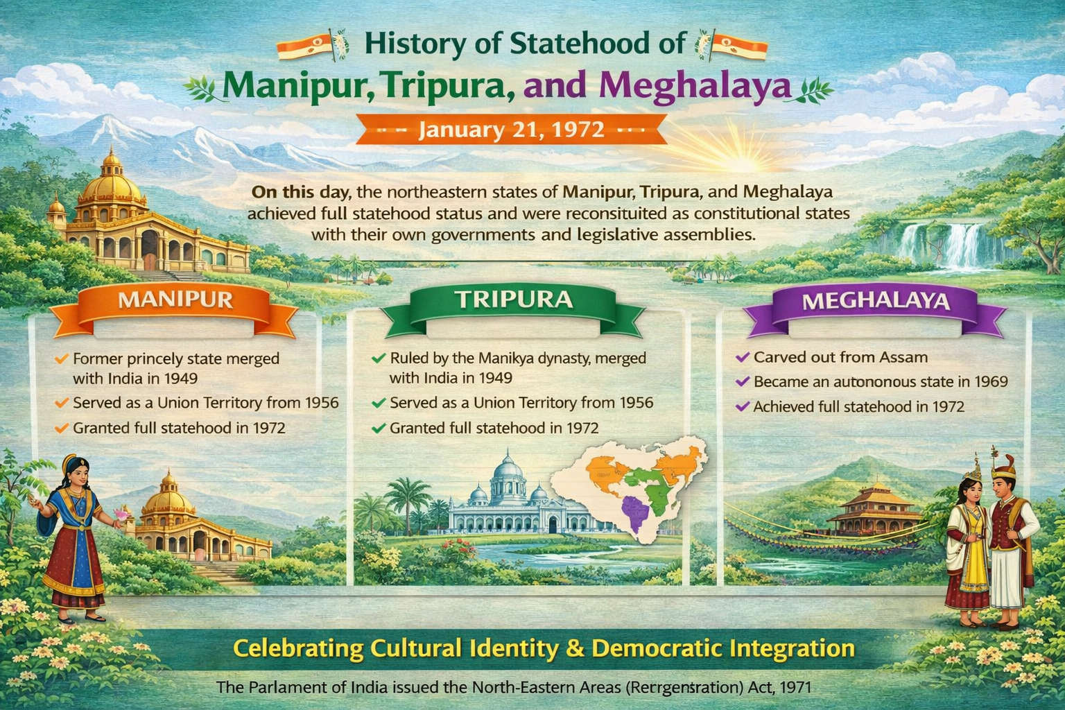 The states of Manipur, Tripura, and Meghalaya observe their statehood day on January 21 every year, marking the day when the three northeastern parts of India – Meghalaya, Tripura, and Manipur – were granted full statehood status under the North-Eastern Areas (Reorganisation) Act, 1971. On this date, Tripura and Manipur, formerly princely states that had acceded to the Indian Union, and Meghalaya, formerly a part of Assam, were reconstituted as separate constitutional states with their own governments and legislative assemblies. This is a day that is observed to celebrate their special cultural identities, democratic integration, and contributions towards the unity and development of India.