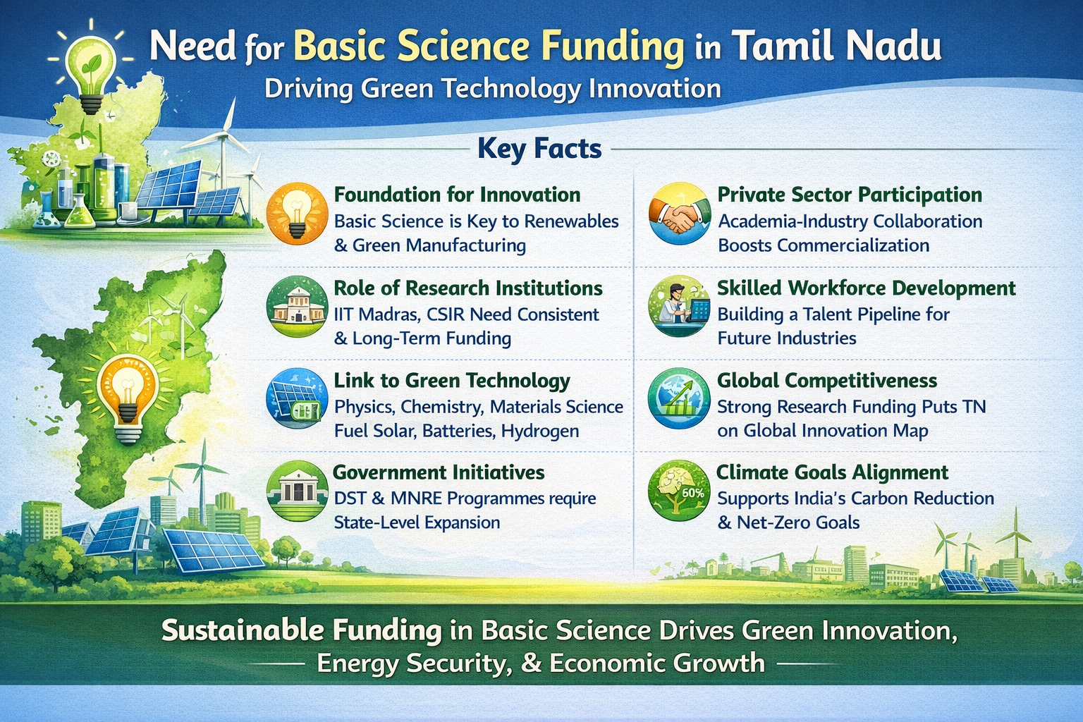 Strengthening basic science funding in Tamil Nadu is crucial for advancing green technology and sustainable development. A strong research base will drive innovation in clean energy, climate solutions, and eco-friendly industries. By investing in fundamental sciences, the state can enhance global competitiveness, support India’s sustainability goals, and build a resilient, future-ready economy.