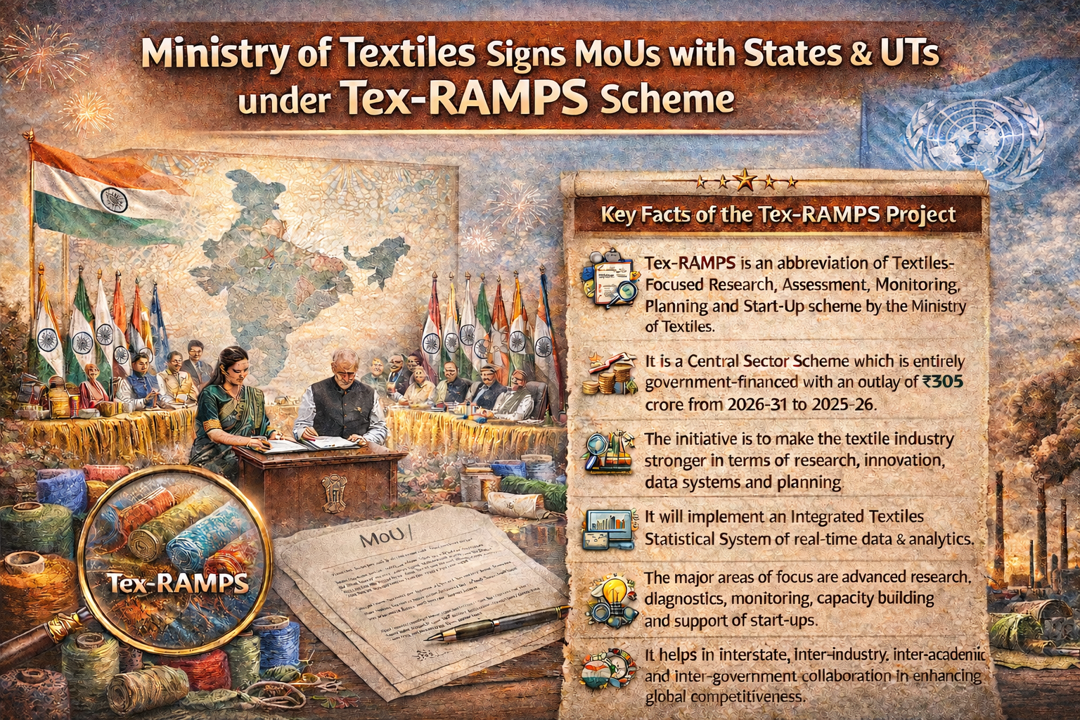 The Ministry of Textiles signed memorandums of understanding with 15 states and Union Territories under the TexRAMPS (Textiles‑focused Research, Assessment, Monitoring, Planning and Start‑Up) scheme to enhance data systems for the textile industry. The new project is expected to increase the coverage, quality, timeliness and credibility of textile-related statistical data and research to support evidence-based policymaking and strong operational frameworks. These agreements were ratified in the National Textiles Ministers Conference in Guwahati, wherein the government gave states financial assistance yearly to enhance the collection and analysis of data. The initiative promotes combined planning in the field of handlooms, handicrafts, apparel and technical textiles, which contributes to growth and investment.