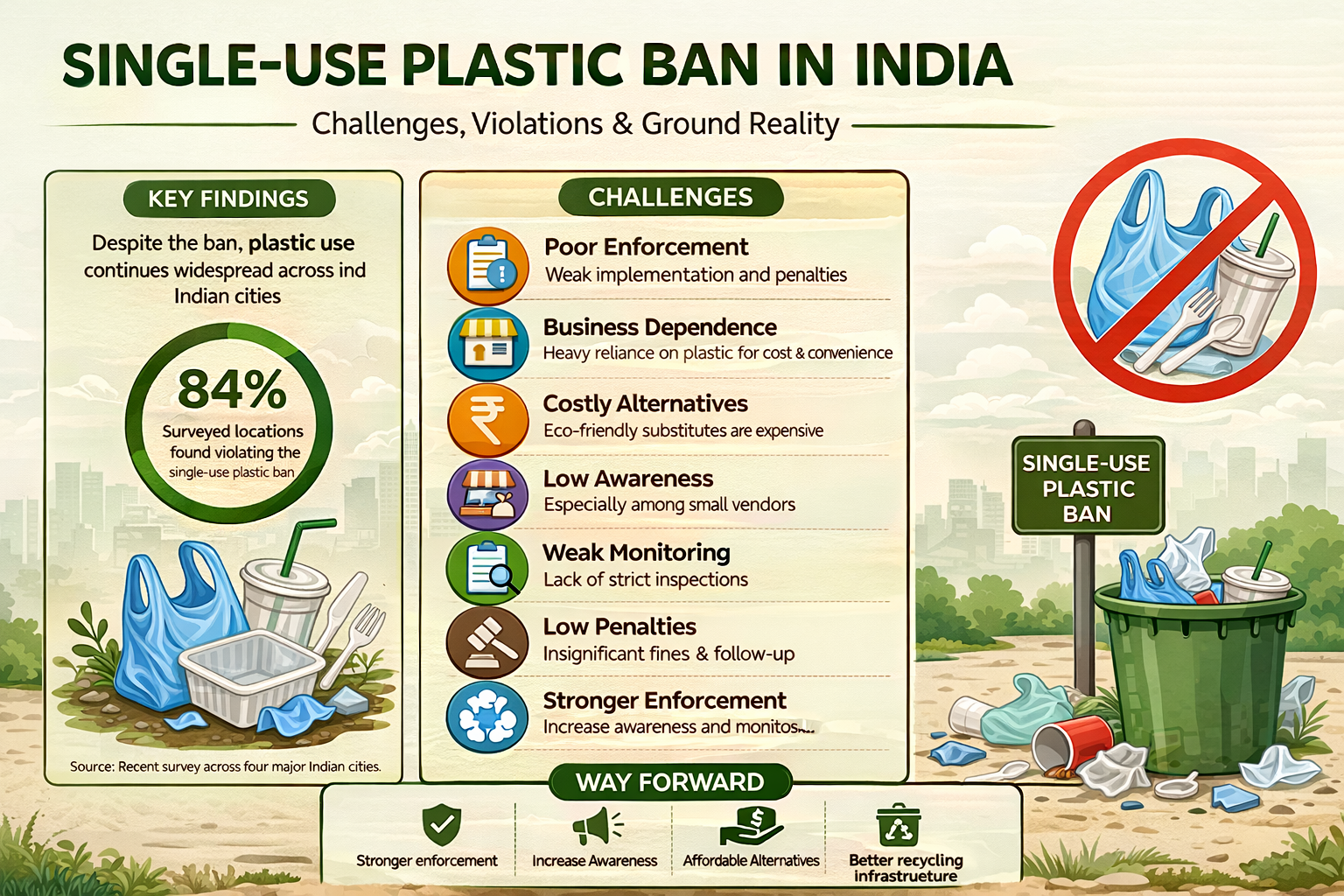 As a significant move to protect the environment and develop sustainably, India's introduction of a ban on single-use plastics was one of the first steps. But as recent observations indicate, the situation is even worse, with almost 84 per cent of the surveyed locations in four cities continuing to use the outlawed plastic products. This also points to implementation loopholes, ignorance, and on-the-ground implementation problems. Even with the obvious regulations and laws, the problem of using single-use plastic still devastates ecosystems, contaminates waters, and adds to the urban garbage issues, which casts significant doubts on the efficiency of the ban.