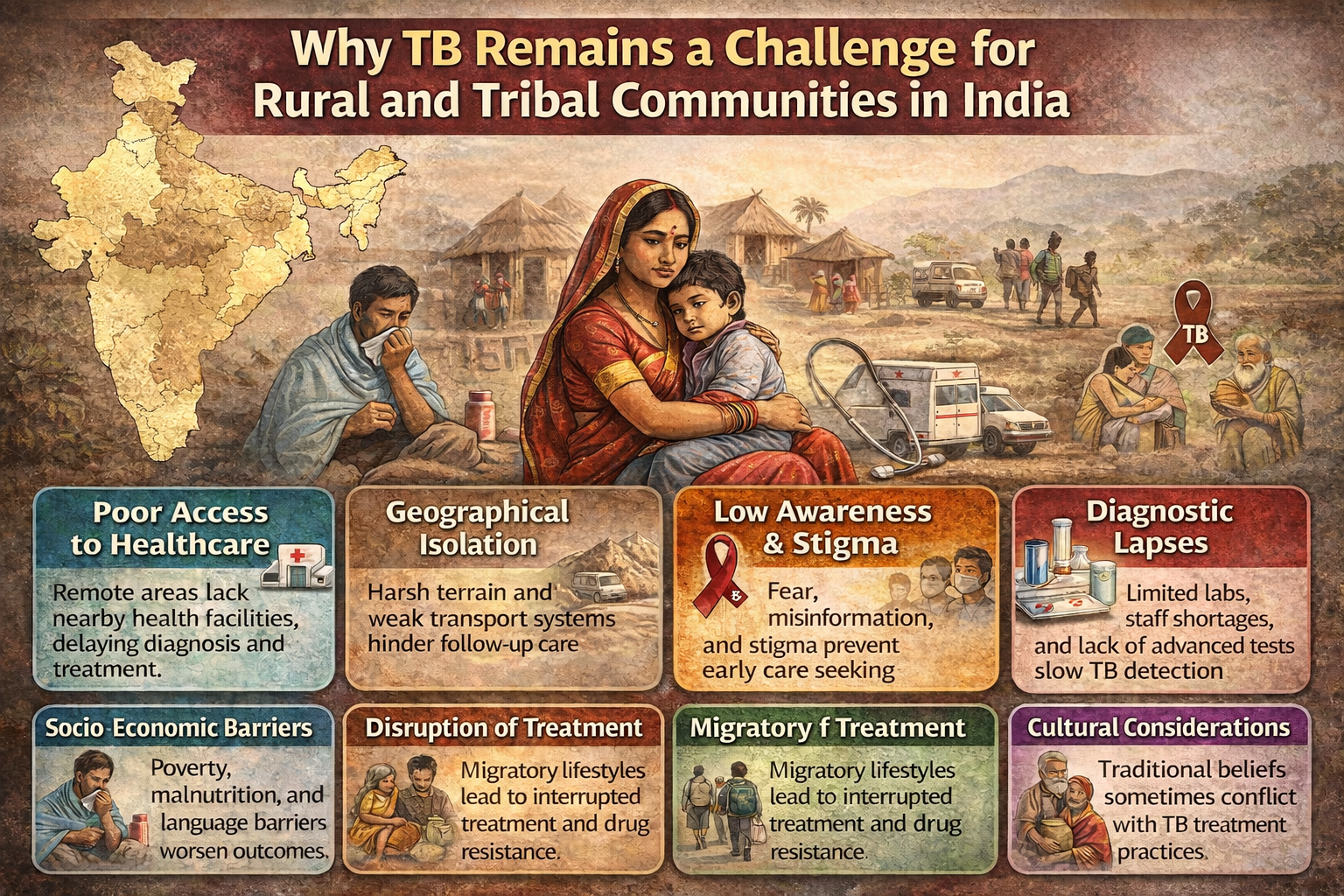 Tuberculosis is a significant social and human health issue in India and other countries and is disproportionately affecting rural, tribal and migrant populations who have an overview of obstacles. Such populations tend to reside in rural or underserved regions and have poor access to medical care, diagnostic services and follow-up treatment. Geographic isolation, poverty, cultural and language barriers, stigma, and poor health infrastructure postpone the diagnosis and treatment of TB, making it more vulnerable and spreading the disease. Migrants specifically face interrupted treatment as a result of mobility and poor living conditions, and tribal populations are subject to institutional unfairness and social exclusion that obstructs the control of TB. These are the combined problems that need tackling to achieve the elimination targets.
