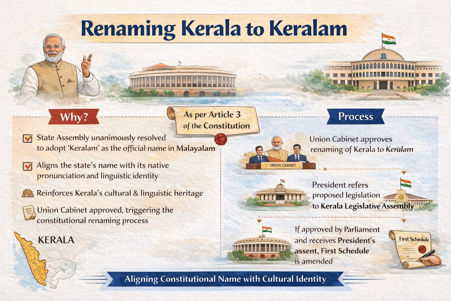 The Union Cabinet, led by Prime Minister Narendra Modi, has approved a proposal to officially change the name of Kerala to Keralam. The decision begins the formal constitutional procedure required to amend the First Schedule of the Constitution under Article 3. As part of the process, the proposed legislation will be referred by the President to the Kerala Legislative Assembly for its opinion. The move follows a unanimous resolution passed by the Assembly seeking to adopt "Keralam", the state’s name in Malayalam, as its official designation, aligning the constitutional name with its cultural and linguistic identity.