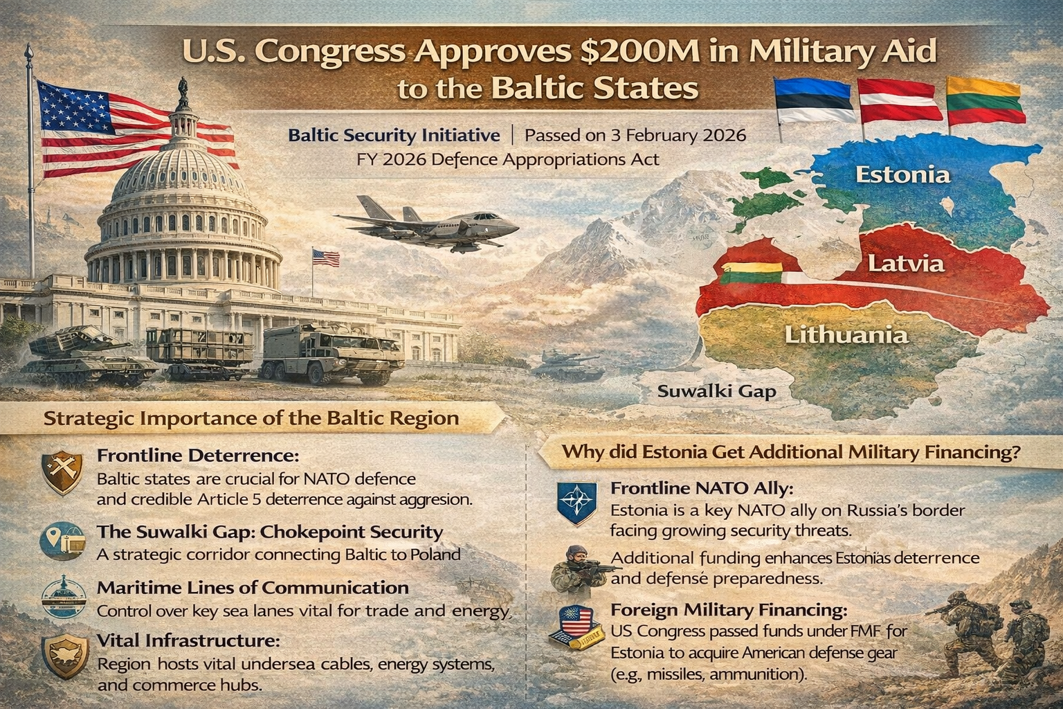On 3 February 2026, the Congress of the United States passed USD 200 million of military aid to the Baltic states of Estonia, Latvia, and Lithuania in the Baltic Security Initiative (BSI) under the Fiscal Year 2026 Defence Appropriations Act. This investment is aimed at consolidating the defence abilities and integration of the Baltic states through the acquisition of the latest US military gear, as well as the improvement of air defence and other important infrastructures. The package takes a fresh commitment to European security and transatlantic defence cooperation by the US in the face of current challenges in the region.