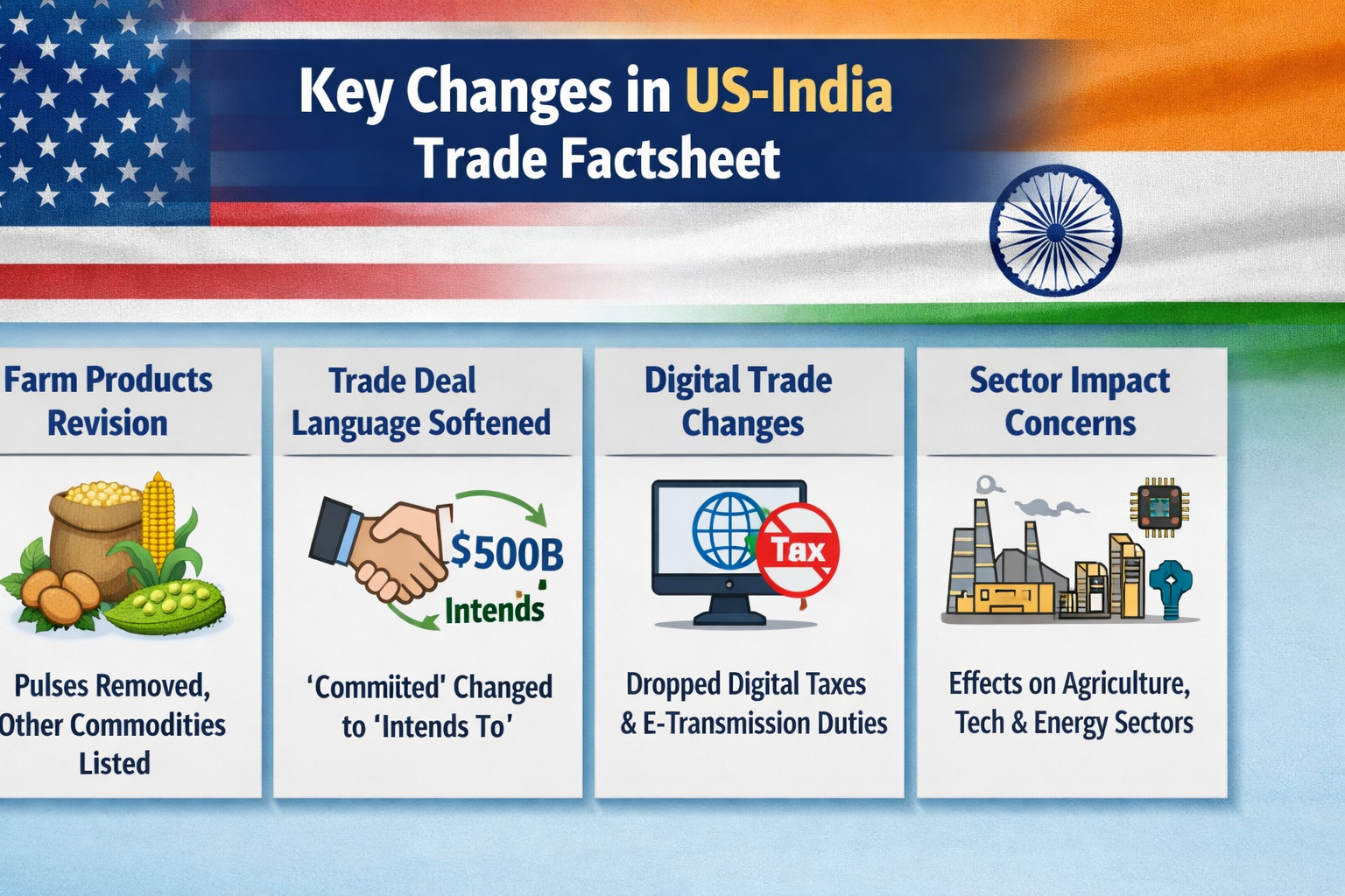 The US government changed its official factsheet on the interim trade agreement with India, which eliminated major language and introduced new ambiguity on what the deal entails. The new version deleted a reference to Indian tariff cuts in pulses, one of the staple agricultural products, and softened the language around the idea that India wants to buy $500 billion of U.S. goods but uses the word 'intends to' in place of 'committed'. It also made language modifications in electronic trade obligations. The developments have contributed to the confusion, and farmer associations and analysts have raised concerns regarding the terms and implications of the changing trade pact between the two nations.