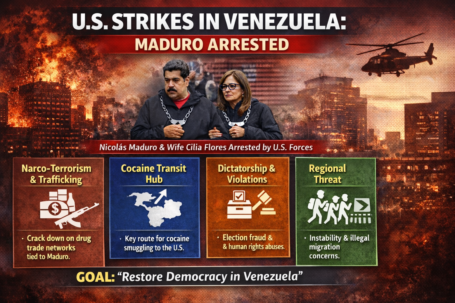 The United States has initiated a significant military operation against Venezuela and has carried out extensive strikes and an organised raid that has seen the Venezuelan President Nicolás Maduro and his wife, Cilia Flores, arrested by the United States government despite his denial. Early on Saturday, President Donald Trump declared that U.S. troops had successfully hit critical targets in Caracas and other locations. Then Maduro and Flores were detained by U.S. forces and flown to New York to be charged in federal court, including with reportedly committing narco-terrorist and drug trafficking crimes. Trump also added that the U.S. would monitor Venezuela until a safe and proper transition was possible to be arranged.